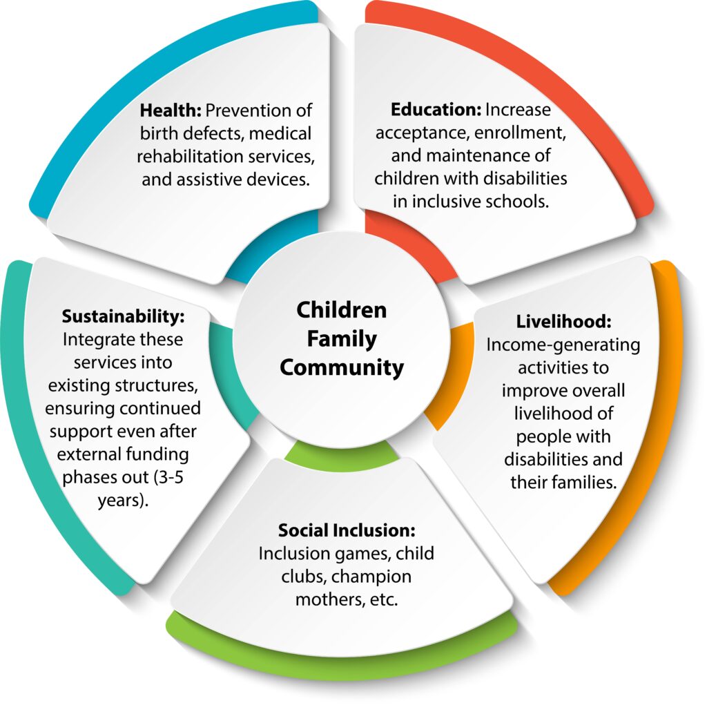 The I2C model places children, family, and communities at the center, focusing on five key areas to build lasting community capacity that will create a brighter future for children with disabilities: